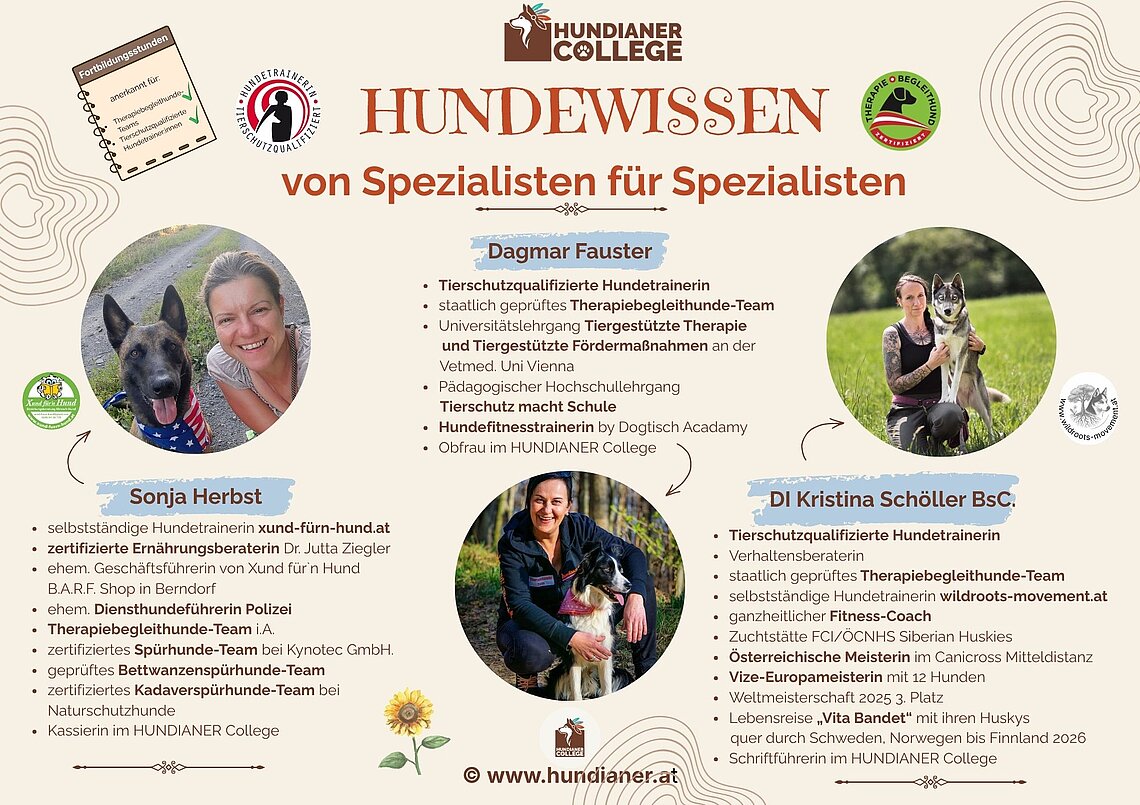Wir bieten als Verein HUNDIANER COLLEGE anerkannte Fortbildungen, Ausbildungen, Prüfungsabnahme, Workshops, Bissprävention, Individualtraining, Socialwalks, Hausbesuche, Beratung und Unterstützung bei Verhaltensproblematiken, Neuanschaffung Hund, Erziehung,